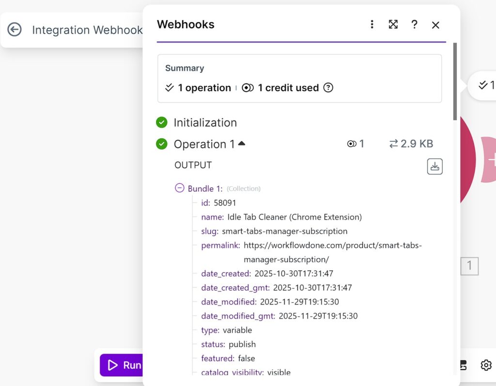 After saving the WooCommerce webhook, edit any product in your store (just change the description and save). Go back to Make.com and click Run once. You should see the product data come through.